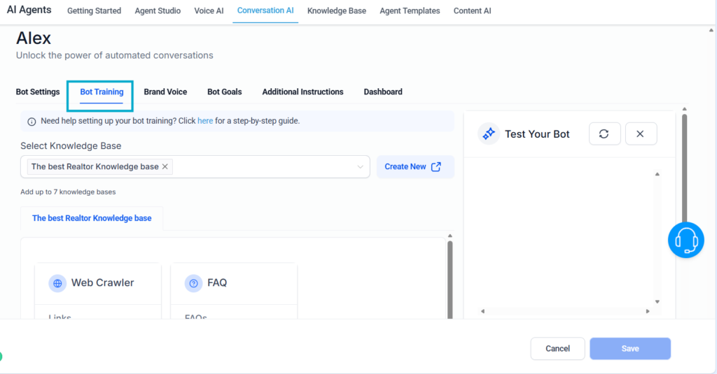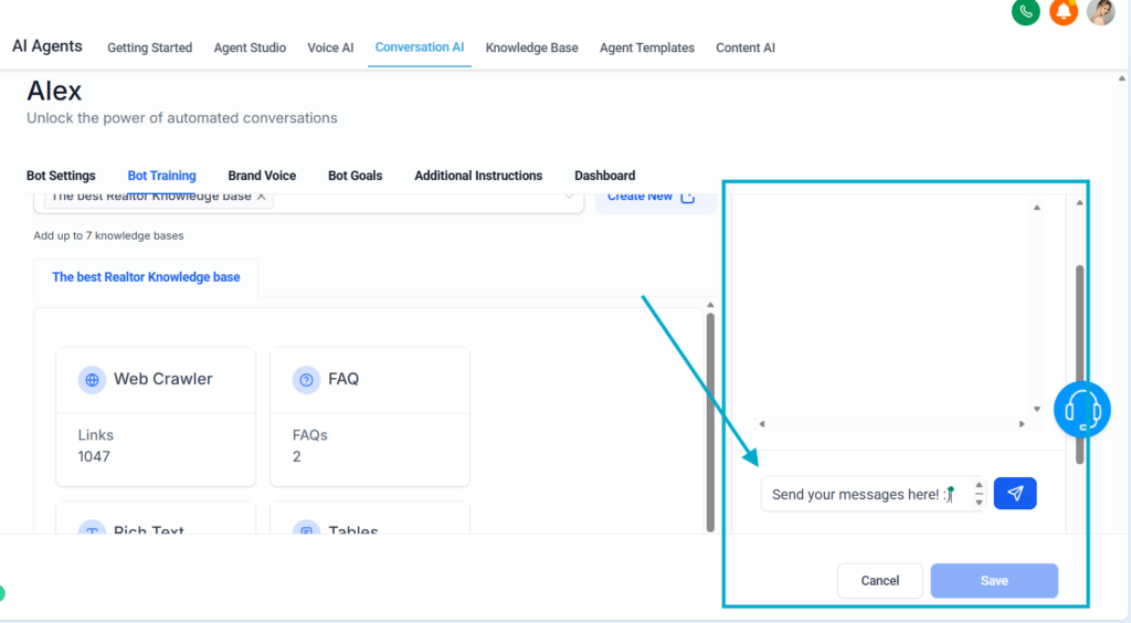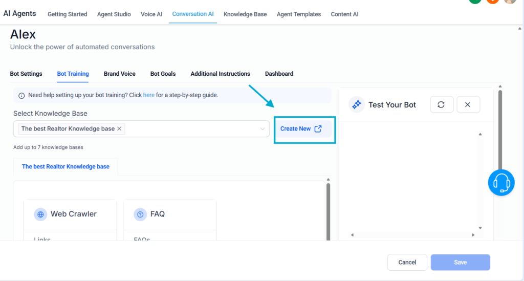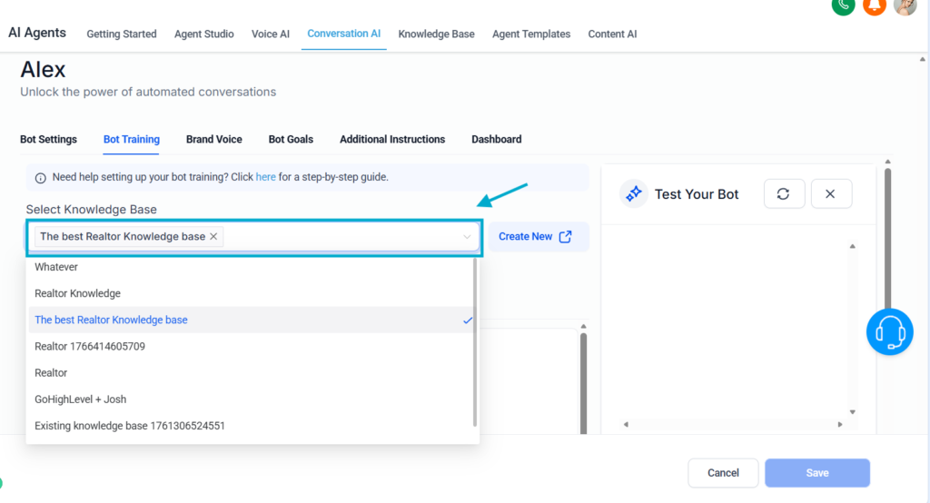 After training, go back to your AI Agent, and choose he knowledge base created.