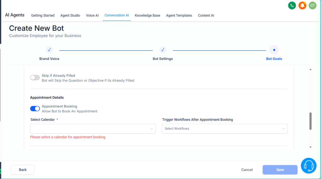 You can choose between a Appointment booking chatbot and a General Q&A. If your primary goal is to get more bookings, choose the Appointment Booking option.