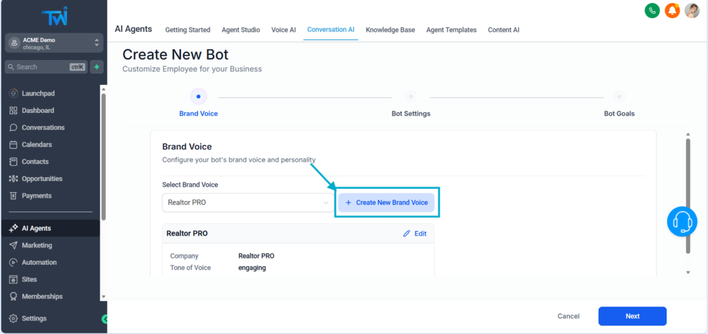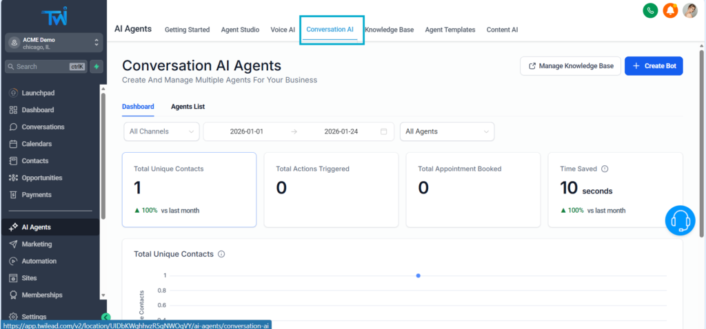 From your dashboard, go to the left-side menu and click AI Agents.