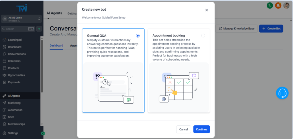 You can choose between a Appointment booking chatbot and a General Q&A. If your primary goal is to get more bookings, choose the Appointment Booking option.